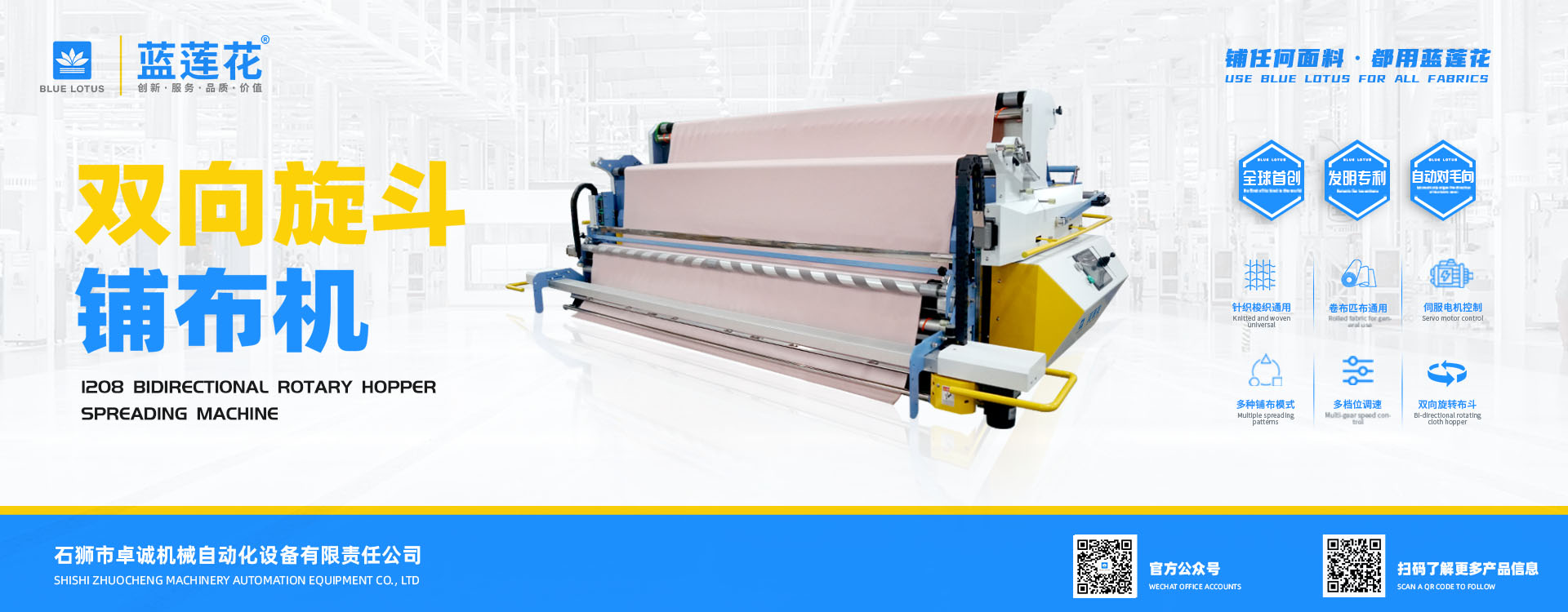 我司結合市場自主研發(fā)的藍蓮花品牌拉布機擁有多項自主專利技術,機器以小巧多功能易操作低維護為特點,為業界提供性價比機型。